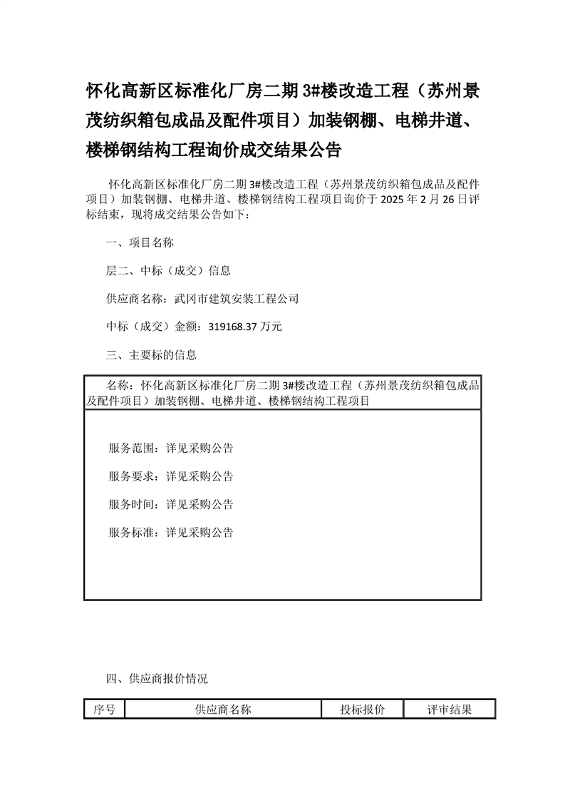 懷化高新區(qū)標(biāo)準(zhǔn)化廠房二期3#樓改造工程(蘇州景茂紡織箱包成品及配件項(xiàng)目)加裝鋼棚、電梯井道、樓梯鋼結(jié)構(gòu)工程詢價(jià)成交結(jié)果公告