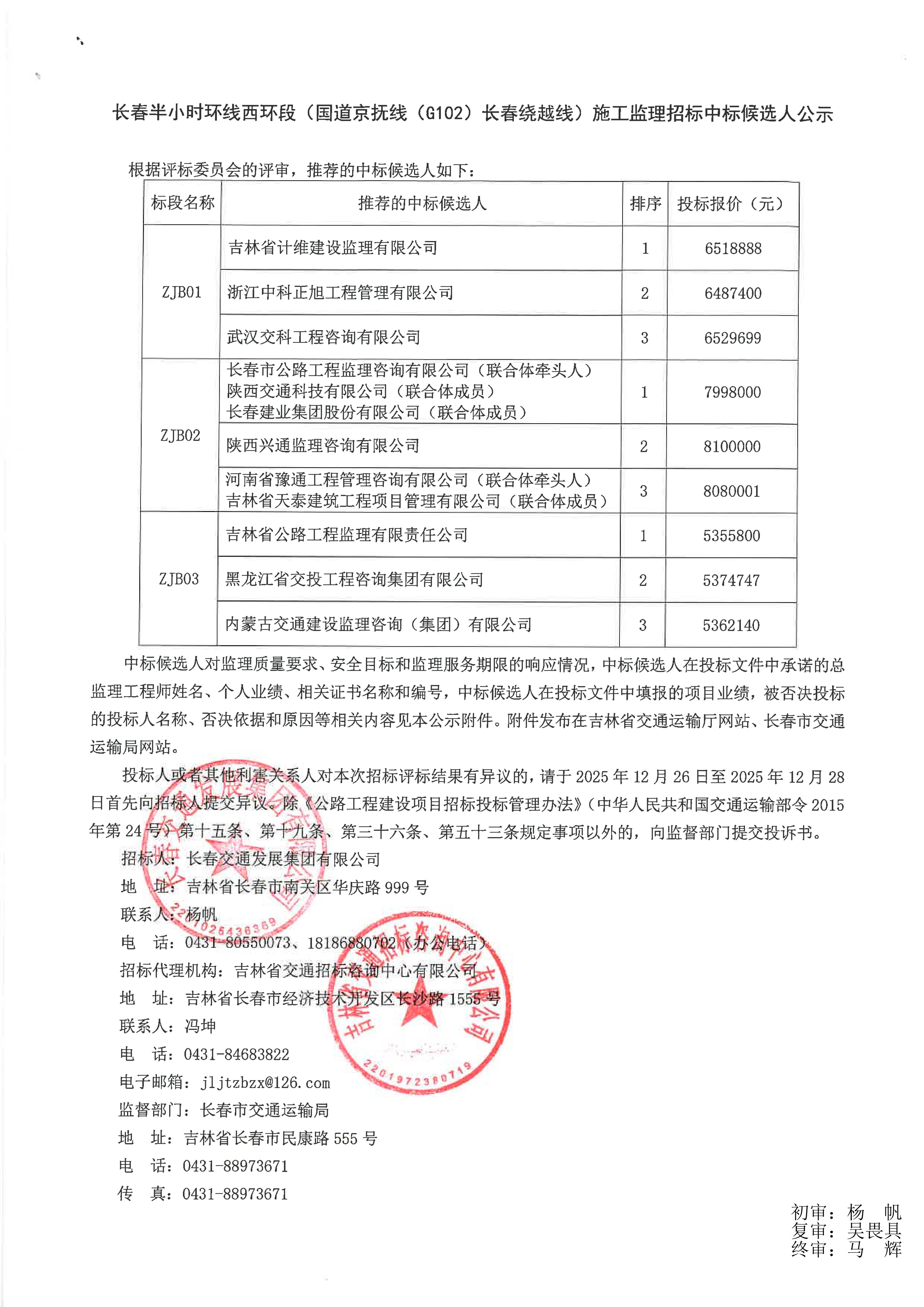 長春半小時環線西環段(國道京撫線(G102)長春繞越線)施工監理招標中標候選人公示