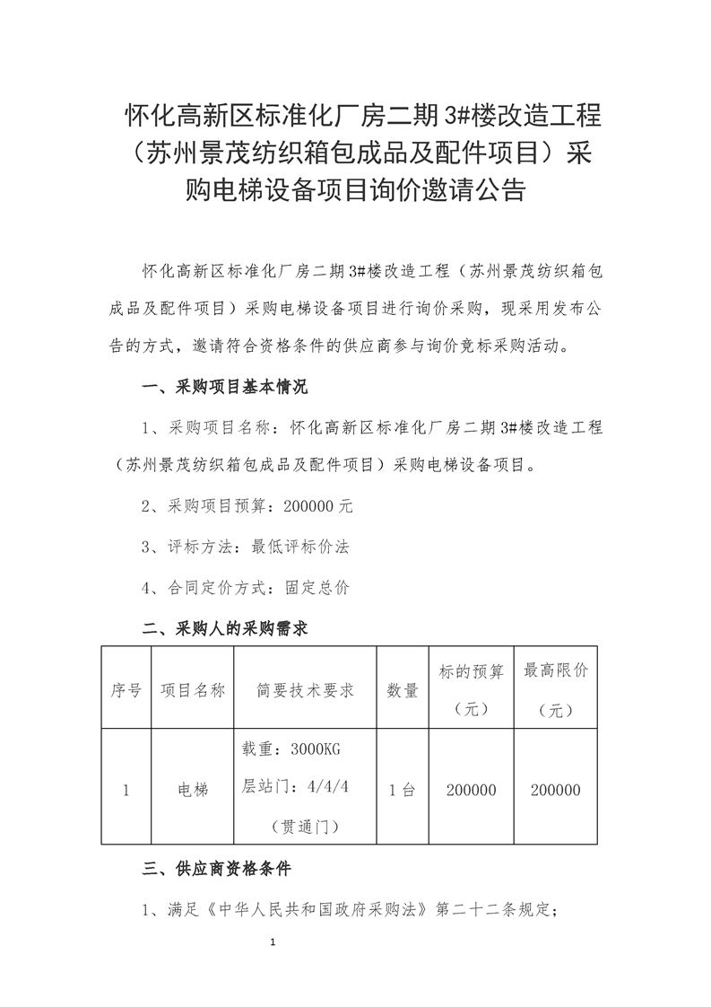 懷化高新區(qū)標(biāo)準(zhǔn)化廠房二期3#樓改造工程(蘇州景茂紡織箱包成品及配件項(xiàng)目)采購電梯設(shè)備項(xiàng)目詢價(jià)邀請公告