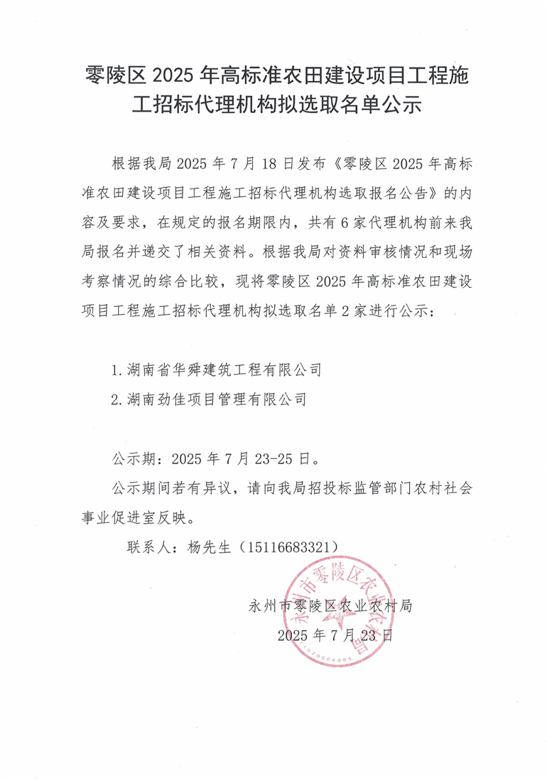 零陵區(qū) 2025 年高標(biāo)準(zhǔn)農(nóng)田建設(shè)項(xiàng)目工程施工招標(biāo)代理機(jī)構(gòu)擬選取名單公示
